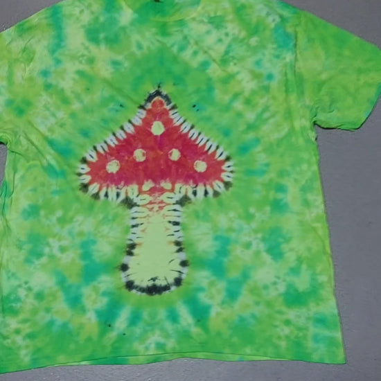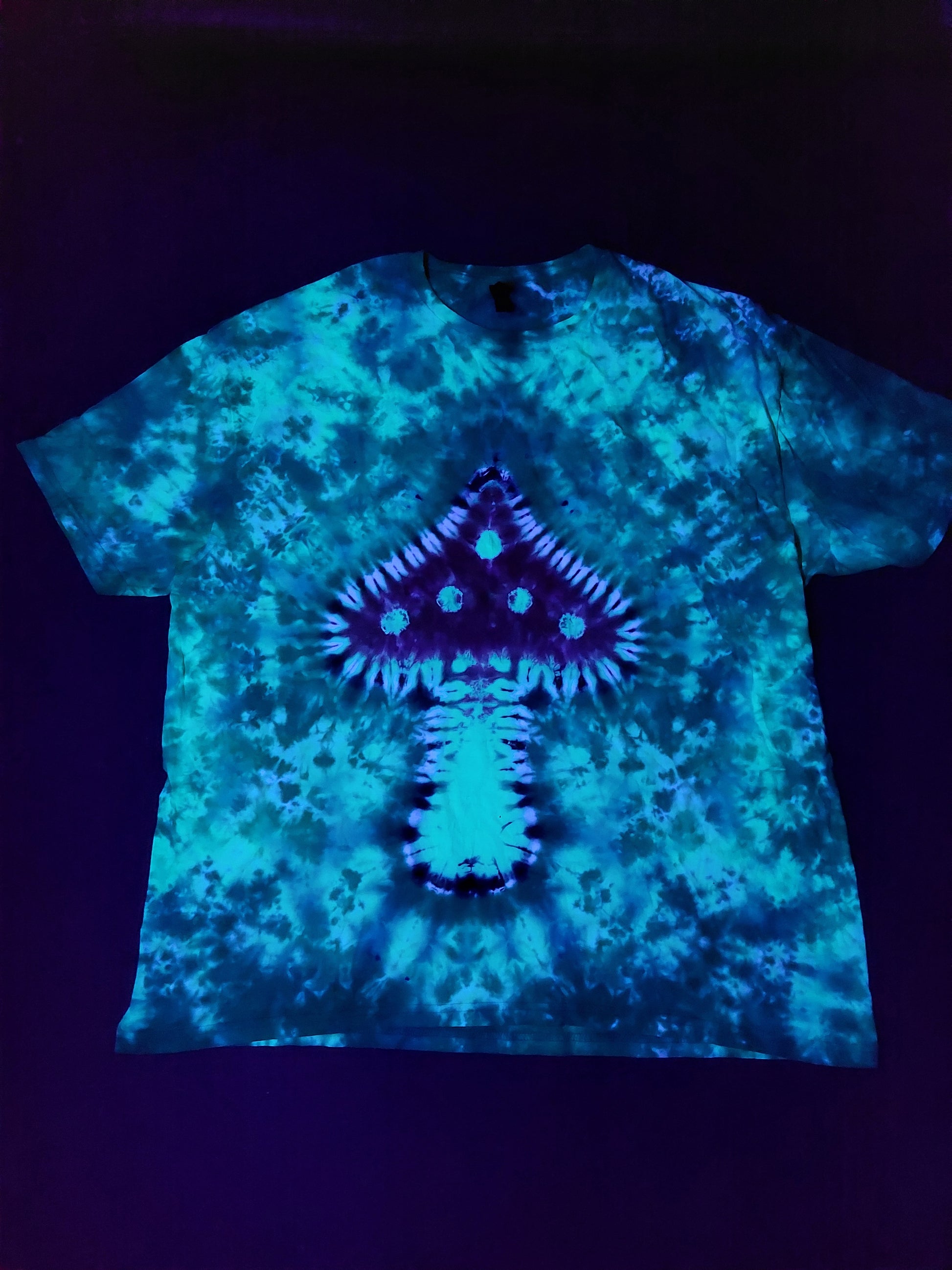 This T shirt is tied in our Magic Mushroom design and dyed with genuine UV reactive dye.