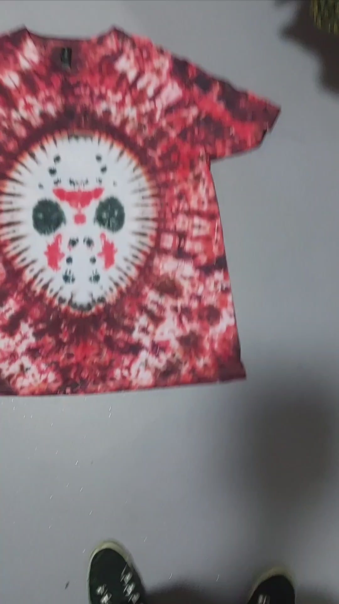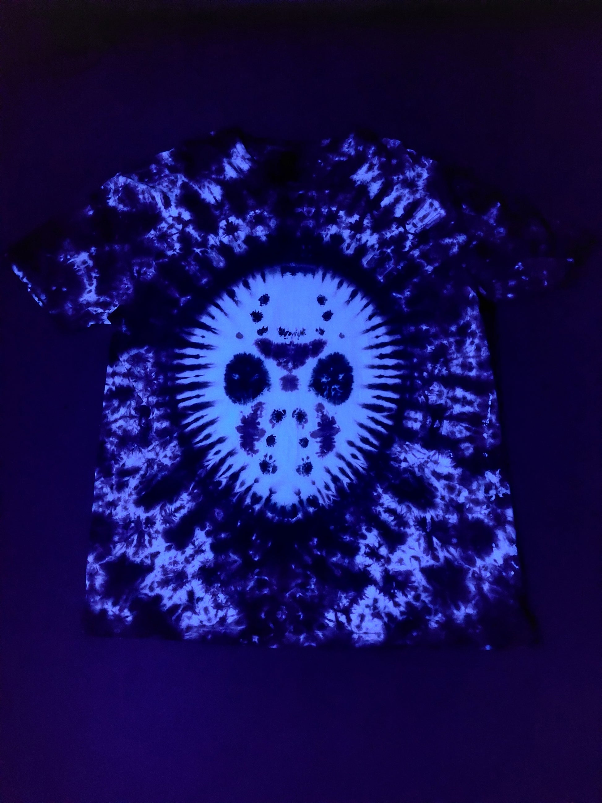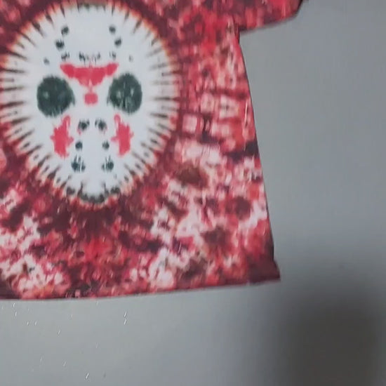 The design features a tie dyed Jason Voorhees style hockey mask surrounded by a scrunched pattern.