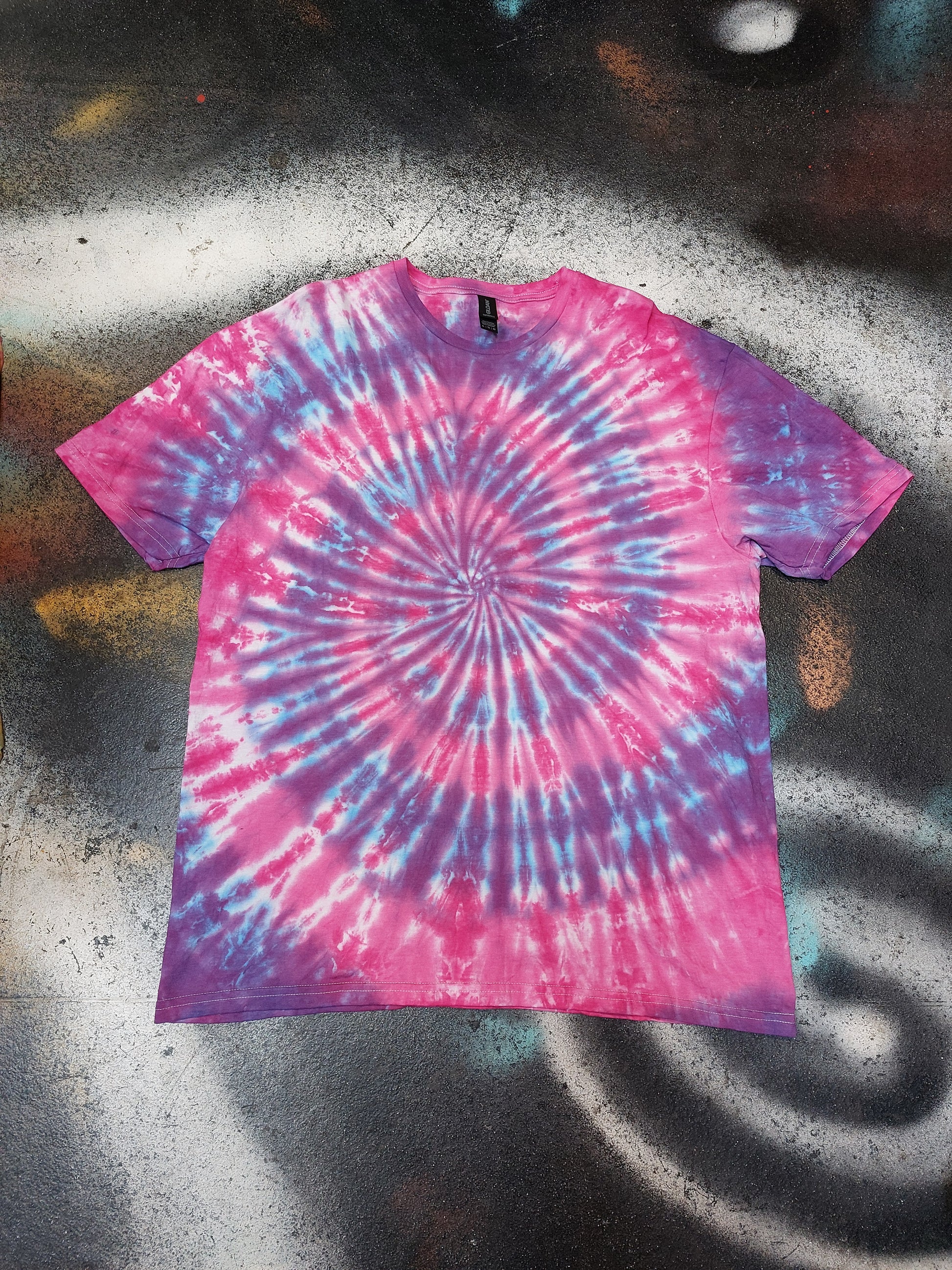 This T shirt is tied with a spiral and dyed in purple and pink colours.